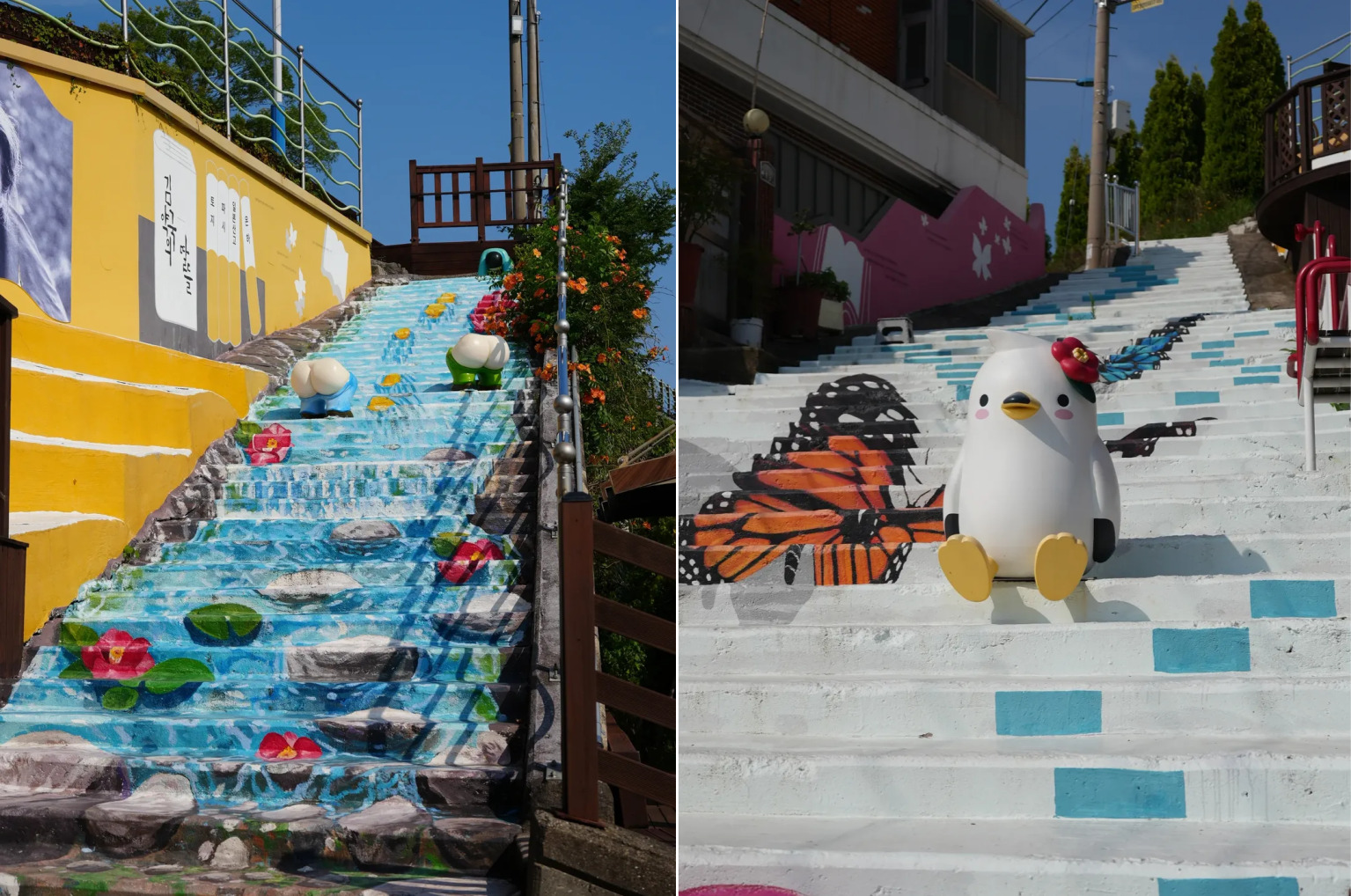 서피랑🪜: 동피랑 맞은편에 위치한 서피랑. 서피랑도 '99계단과 음악정원', '서피랑 문학동네', '피아노 계단' 등으로 아기자기하게 꾸며져 있어요. 99계단은 서피랑 대표 사진 스팟이라서 꼭 가보시는 걸 추천. 동피랑보다 한적해서 더 걷기 좋더라고요. 또 서포루에서 내려다보는 전망이 진짜 끝장나요!